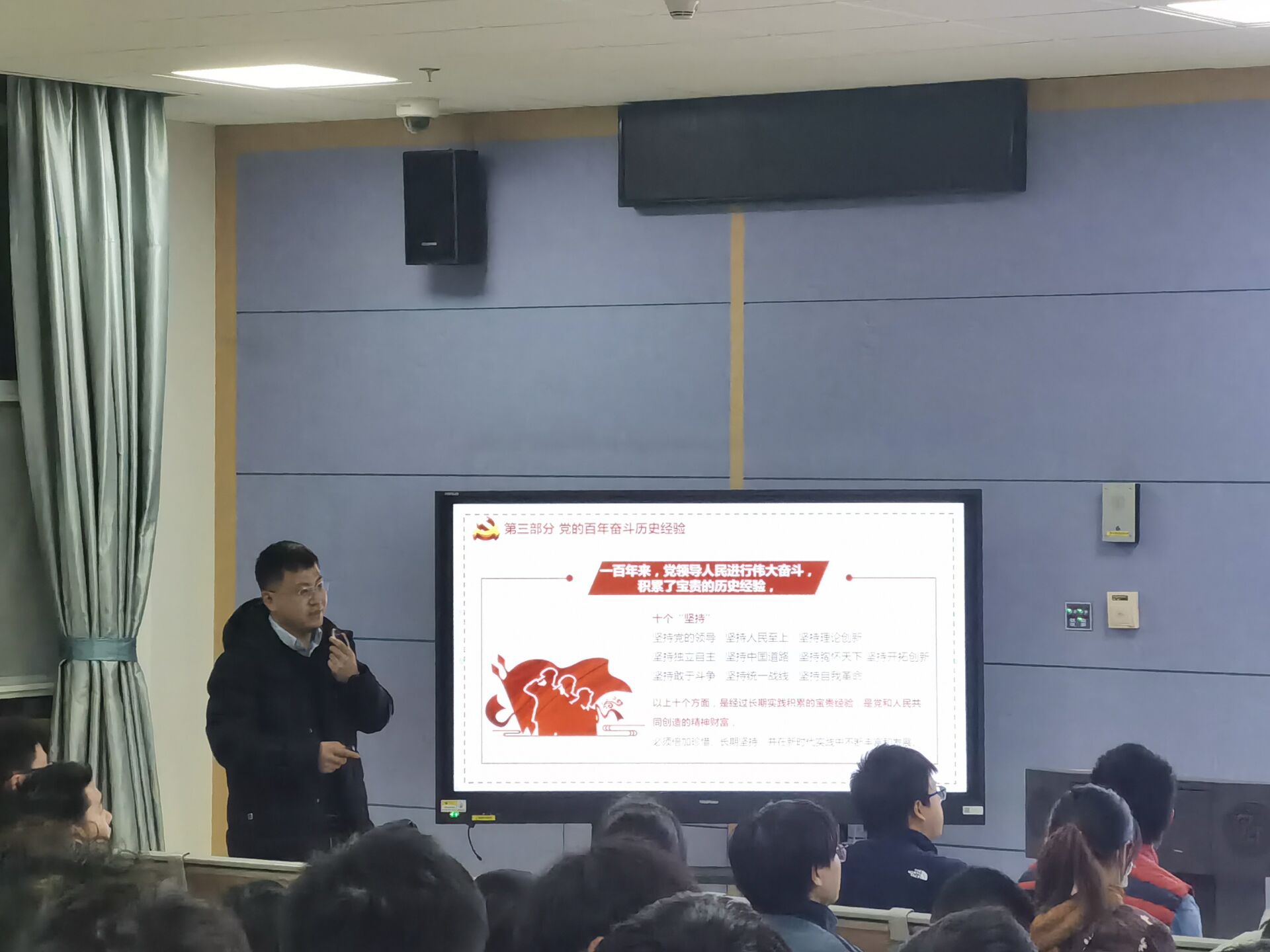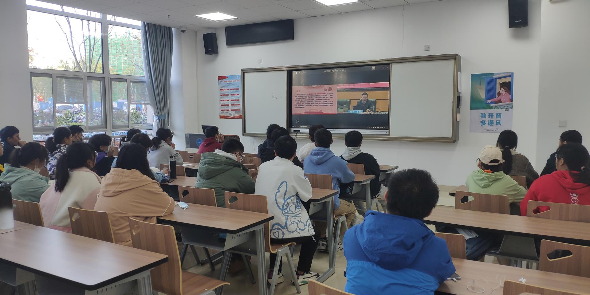 孙宇涛老师带领同学们一起学习党的十九届六中全会精神。他此讲的主要内容,介绍十九届六中全会会议,阐释了党的百年奋斗的重大成就与党的百年奋斗的历史经验,强调不忘初心推进中华民族伟大复兴的使命。鼓励同学们积极响应党中央号召,埋头苦干、勇毅前行,为实现第二个百年目标努力奋斗。让同学们在激励中深刻认识到党的十九届六中全会精神。