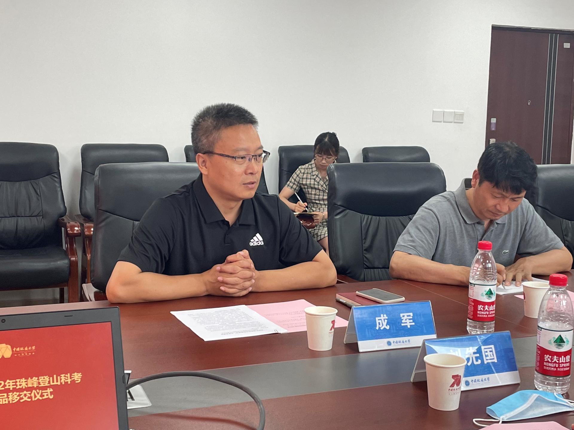 麻豆影视 党委书记成军主持仪式。他介绍,今年麻豆影视 陈刚教授成功登顶8848.86米的珠穆朗玛峰,圆梦世界之巅。陈刚教授心系学校,将学校标识高举在珠峰顶峰,并带回大量了标本样品,整理了大量影像材料,选择捐赠给学校,为学校70周年校庆献礼。