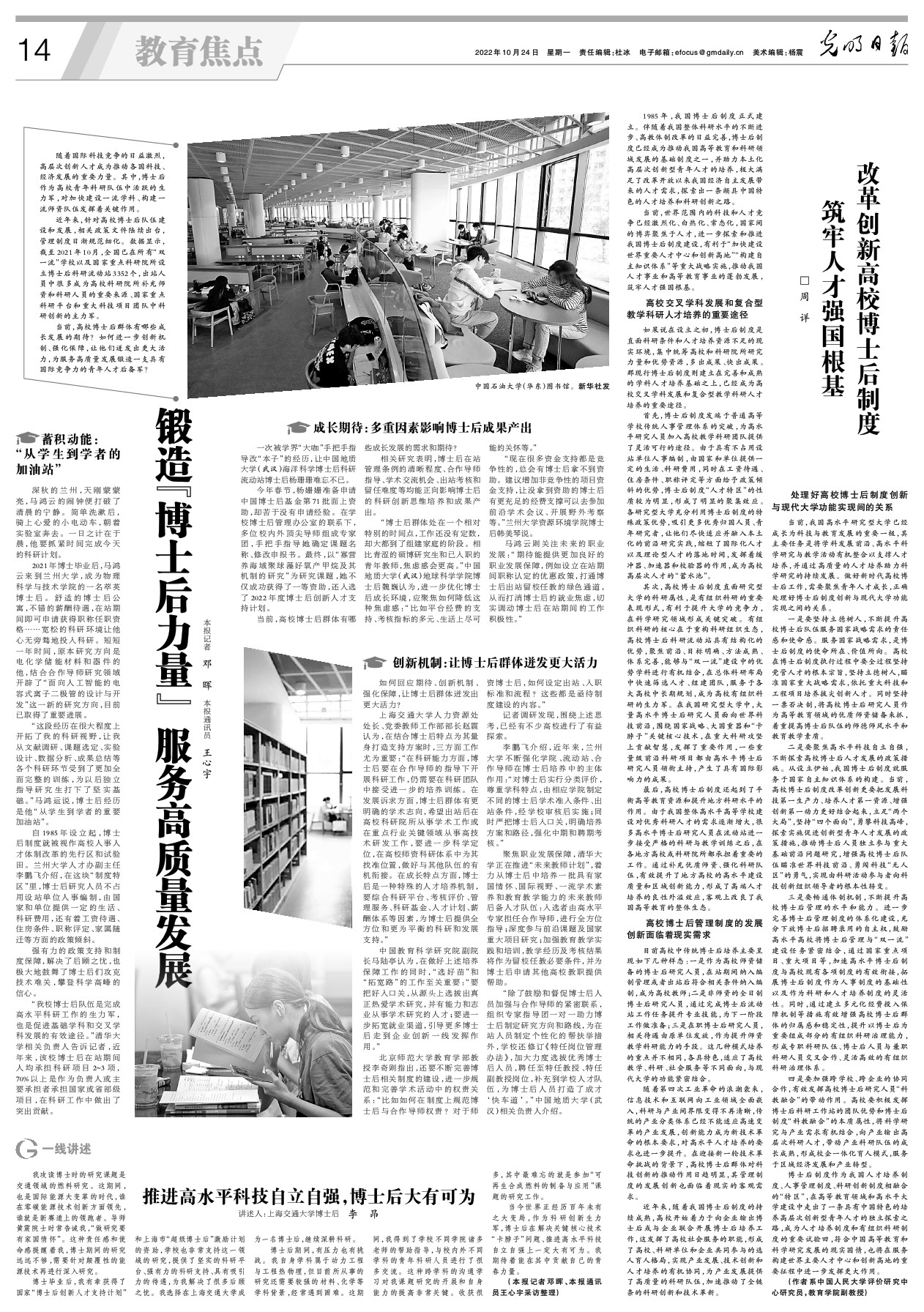 2022年10月24日,光明日报发表了一篇题为《锻造“博士后力量” 服务高质量发展》的报道。在“成长期待:多重因素影响博士后成果产出”版块中,报道了麻豆影视 博士后杨姗姗项目申报经历:今年春节,杨姗姗准备申请中国博士后基金第71批面上资助,却苦于没有申请经验。在学校博士后管理办公室的联系下,多位校内外顶尖导师组成专家团,手把手指导她确定课题名称、修改申报书。最终,以“寡营养海域聚球藻好氧产甲烷及其机制的研究”为研究课题,她不仅成功获得了一等资助,还入选了2022年度博士后创新人才支持计划。