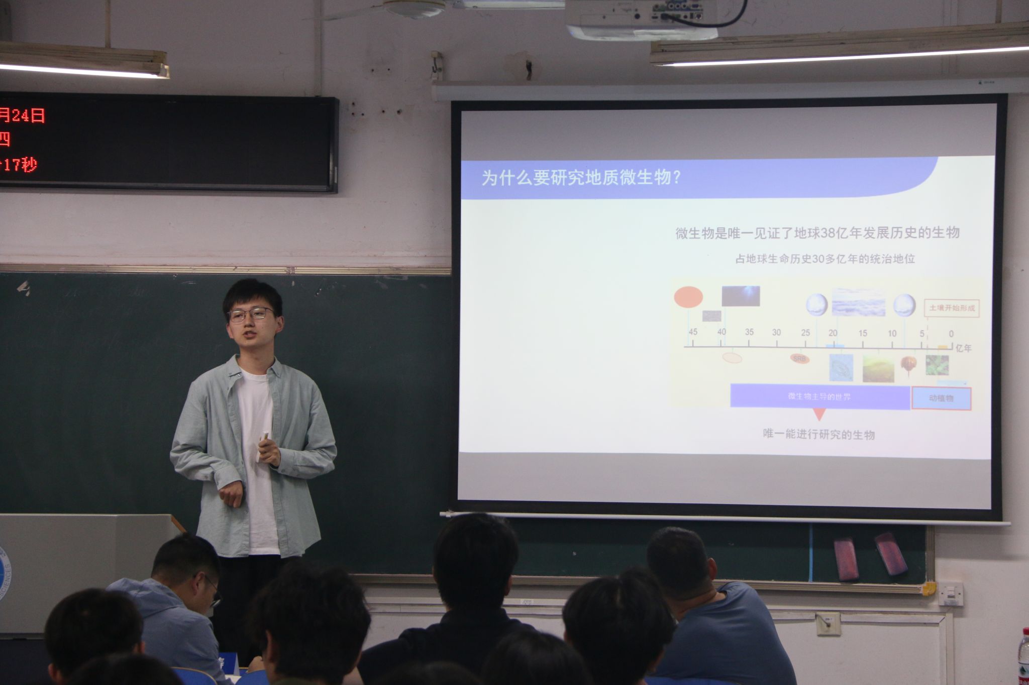 杨义老师详细介绍了分子地球生物学团队及其研究方向,围绕地质微生物的研究展开讲解,包括地质微生物在生物地质演化中的重要性及其研究技术方法,并展示了团队在陆海统筹地质微生物与海洋碳埋藏过程方面的成果。他期待更多同学加入他的团队,共同进步。