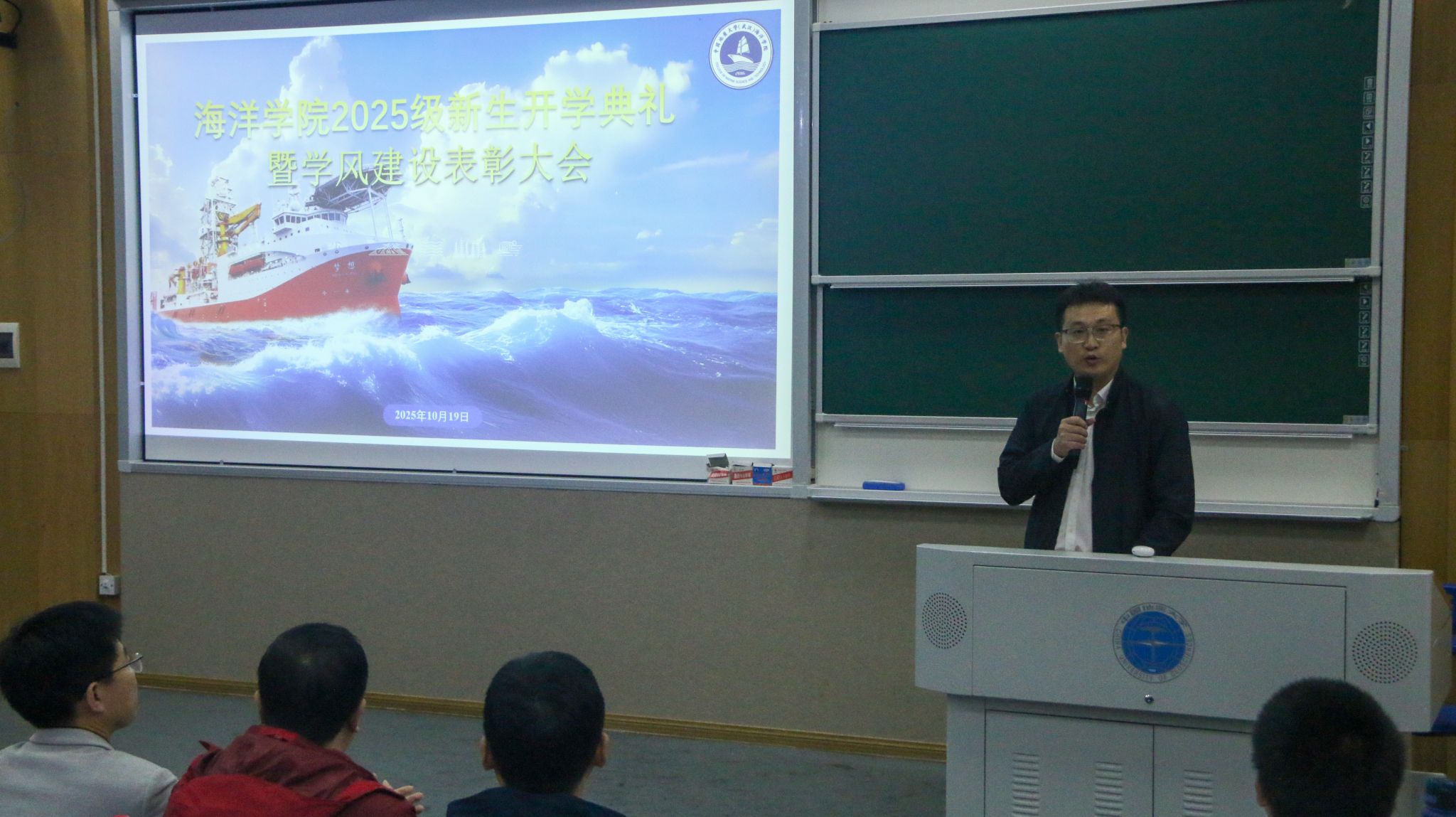 10月19日上午9:00,麻豆影视 2025级新生开学典礼暨学风建设表彰大会在西区教三楼110教室隆重举行。麻豆影视 团委书记、辅导员陈波主持典礼,特邀校友代表、广州海洋地质调查局副总工程师沙志彬、党委书记刘国华,副院长孙启良、副院长陈刚、各系主任、教师代表、新生班主任、学生代表以及2025级全体新生共同参加此次典礼。