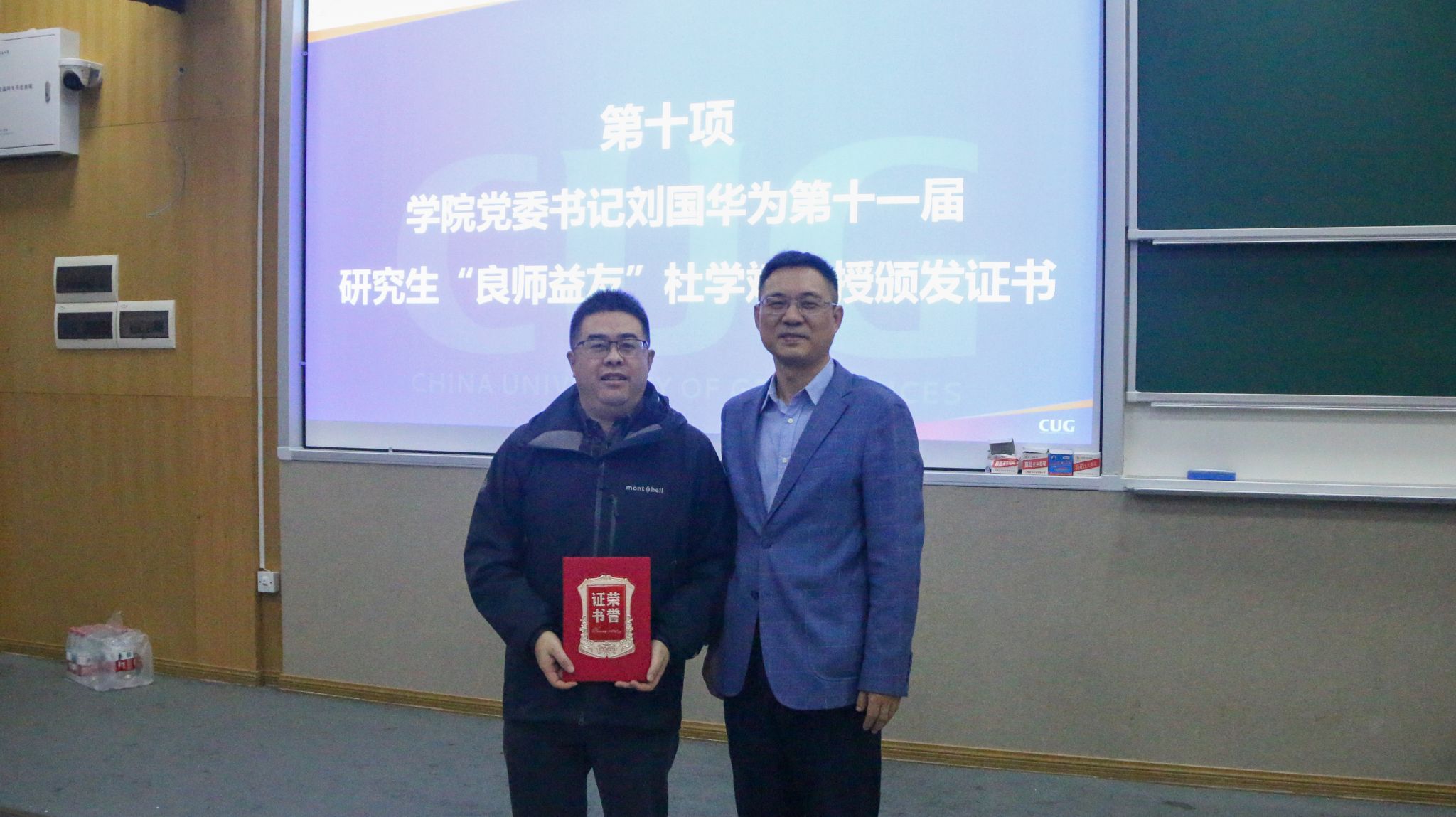 麻豆影视 党委书记刘国华为第十一届研究生良师益友杜学斌教授颁发证书。
