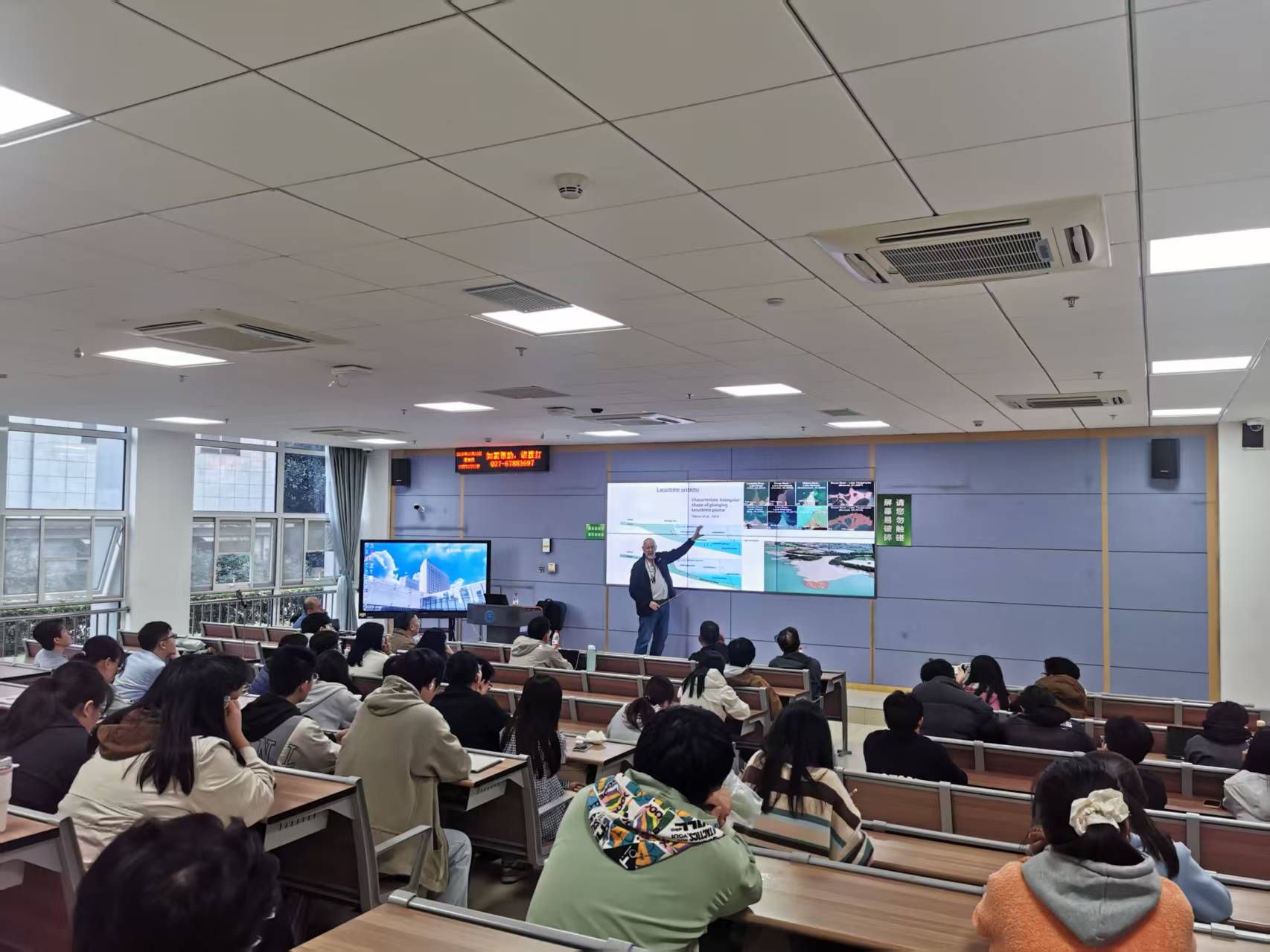 报告系统介绍了自然界中存在的不同类型重力流的行为机制,并阐释了重力流运动过程与海底沉积地貌与沉积物之间的成因联系,报告内容对于深水油气勘探以及海洋工程相关研究工作具有重要的启示意义。针对报告内容,前来参加讲座的师生与Kneller教授展开了深入的讨论。