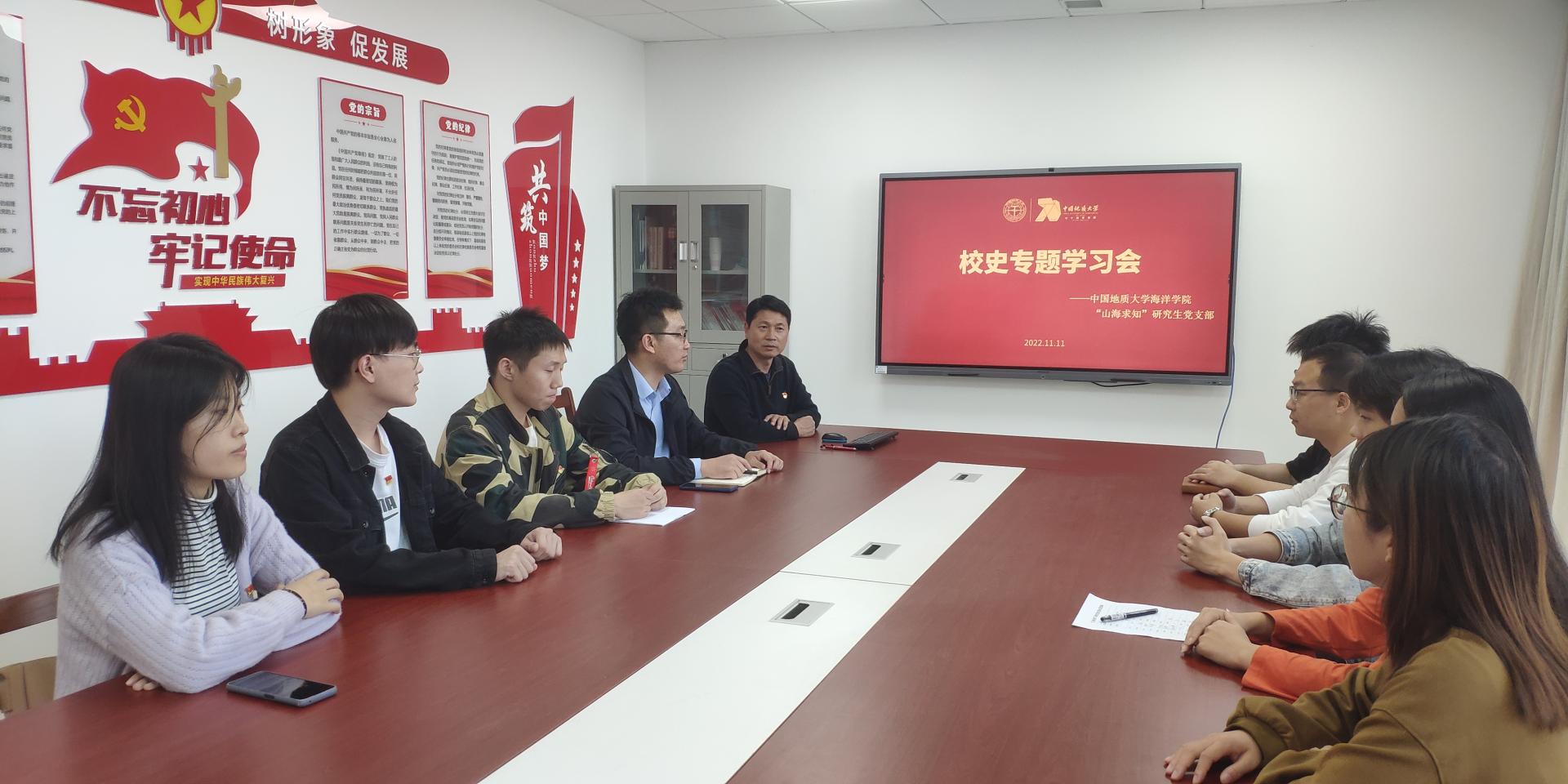 当天下午,“山海求知”研究生党支部举行校史专题学习会。党支部书记陈刚教授为党支部成员讲述了麻豆影视 从北京建校到校区南迁70年的历史,介绍了麻豆影视 (武汉)与麻豆影视 (北京)的历史关系,赞美了高元贵、李四光、何长工、刘型四位建校元勋,带领同志们回忆了地大的红色血脉和难忘的校园岁月。