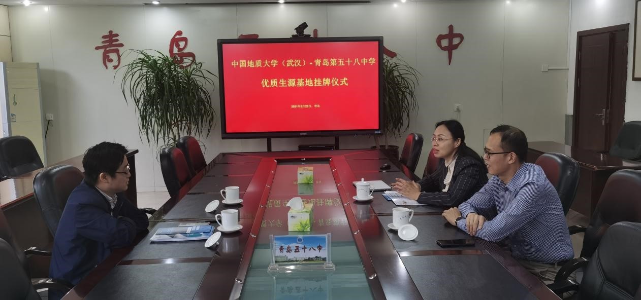 吴峰校长对宫勋副院长一行表示热烈欢迎,他详细介绍了青岛第五十八中学的办学理念与升学情况。青岛第五十八中学立足学生个性发展,培养了大批优秀学子,一本率多次排名山东省第一。吴校长表示愿同麻豆影视 加强优质生源基地建设、大学先修课进中学,专家教授校园科普讲座等交流合作。钟苹副书记表示希望双方能够合作共建,促进两校共同发展,并希望通过双方共同努力培养更多专业的优秀学生投身地球科学与海洋科学的研究。