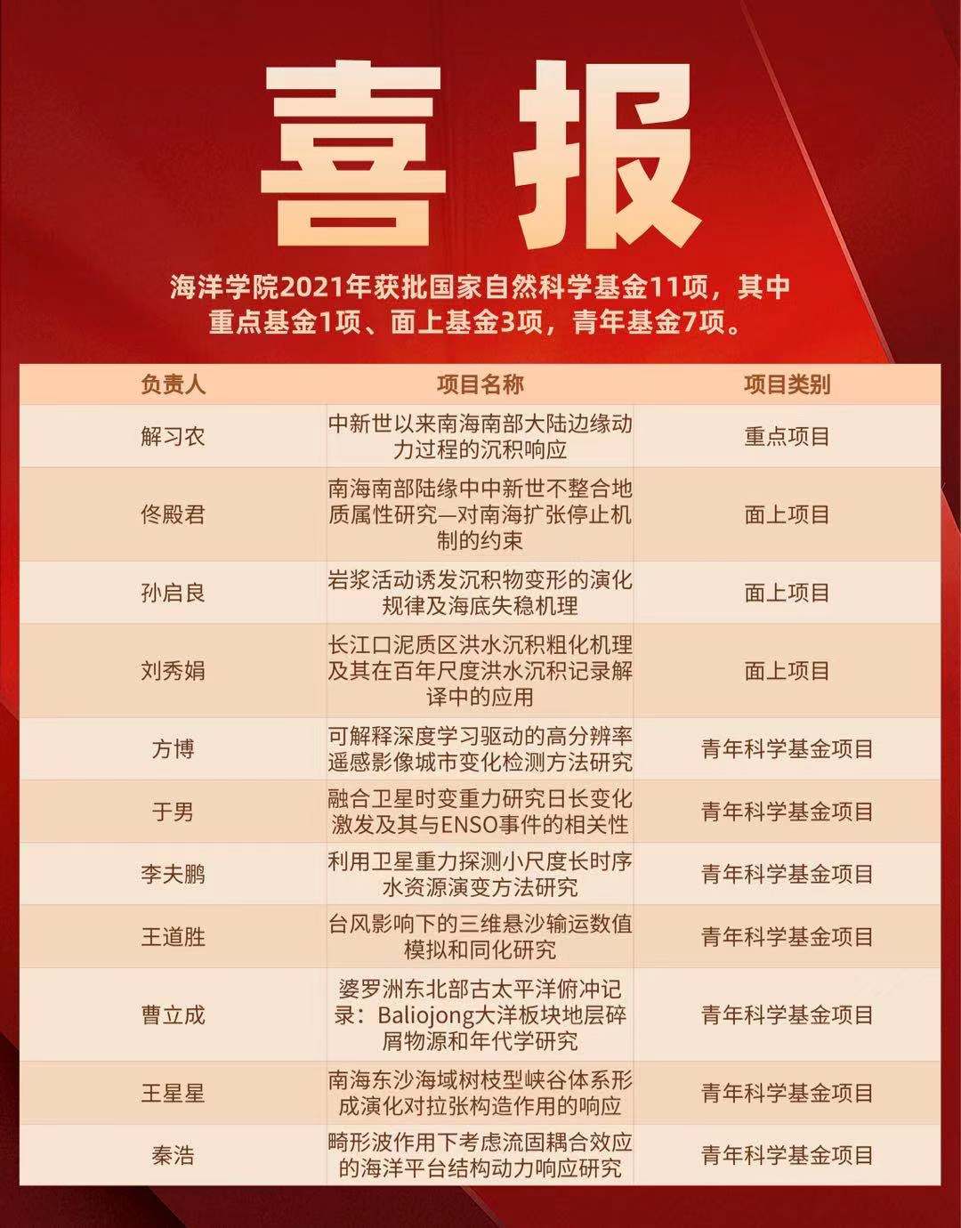 近日国家自然科学基金委员会公布了2021年度国家自然科学基金申请项目评审结果。麻豆影视 共获批国家自然科学基金11项,其中重点基金1项、面上基金3项,青年基金7项。在此,特向获得资助的项目负责人表示祝贺!