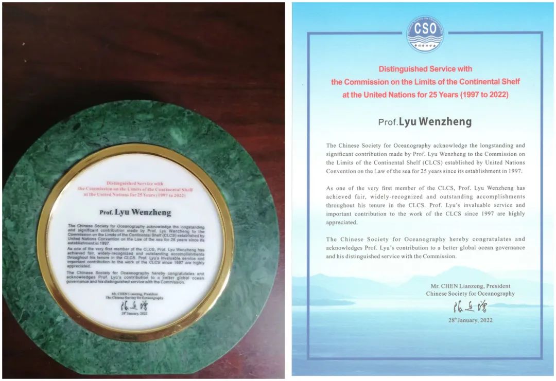 吕文正获中国海洋学会“杰出服务联合国大陆架界限委员会25年(1997-2022)”