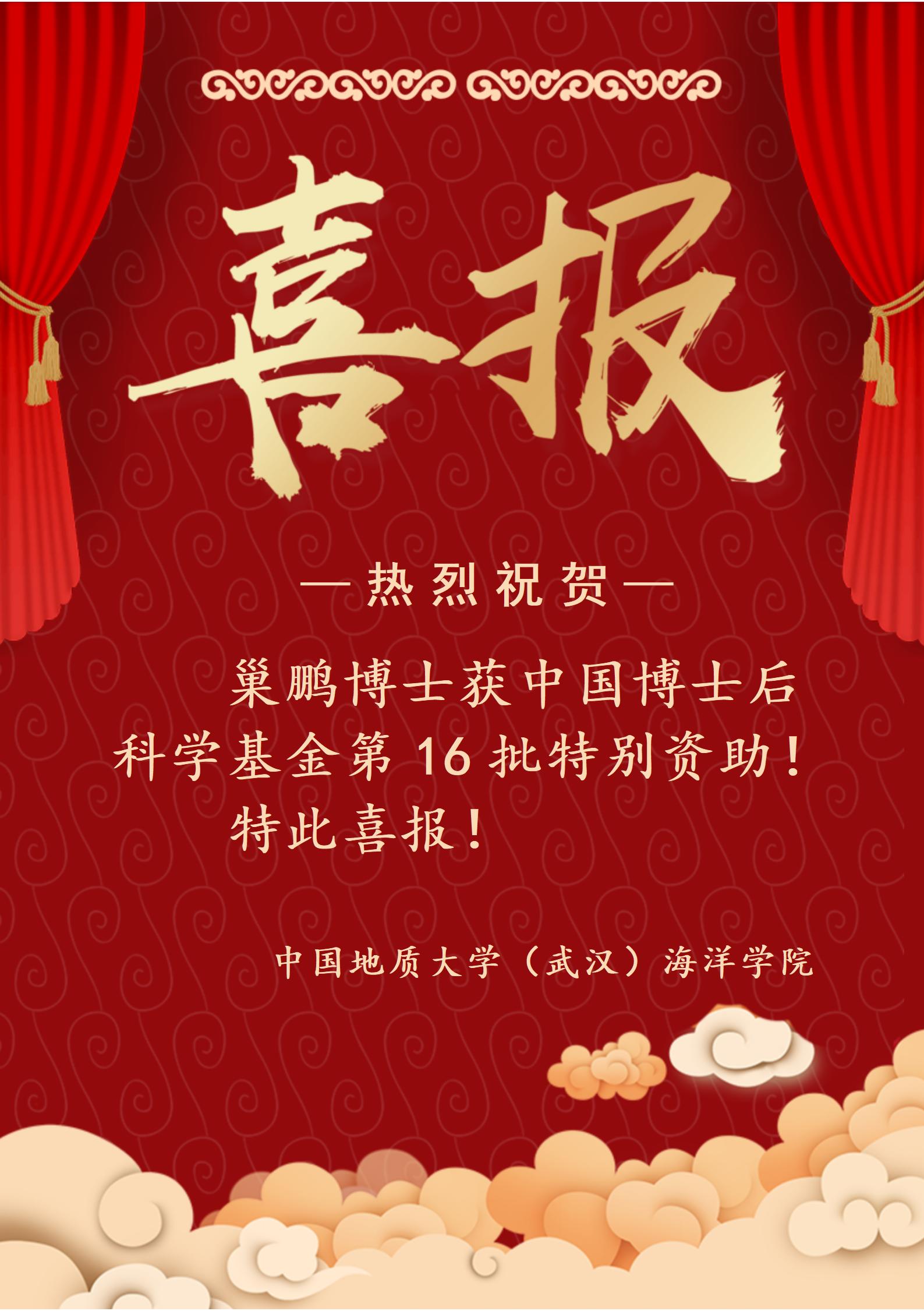 喜报!麻豆影视 巢鹏博士获中国博士后科学基金第16批特别资助