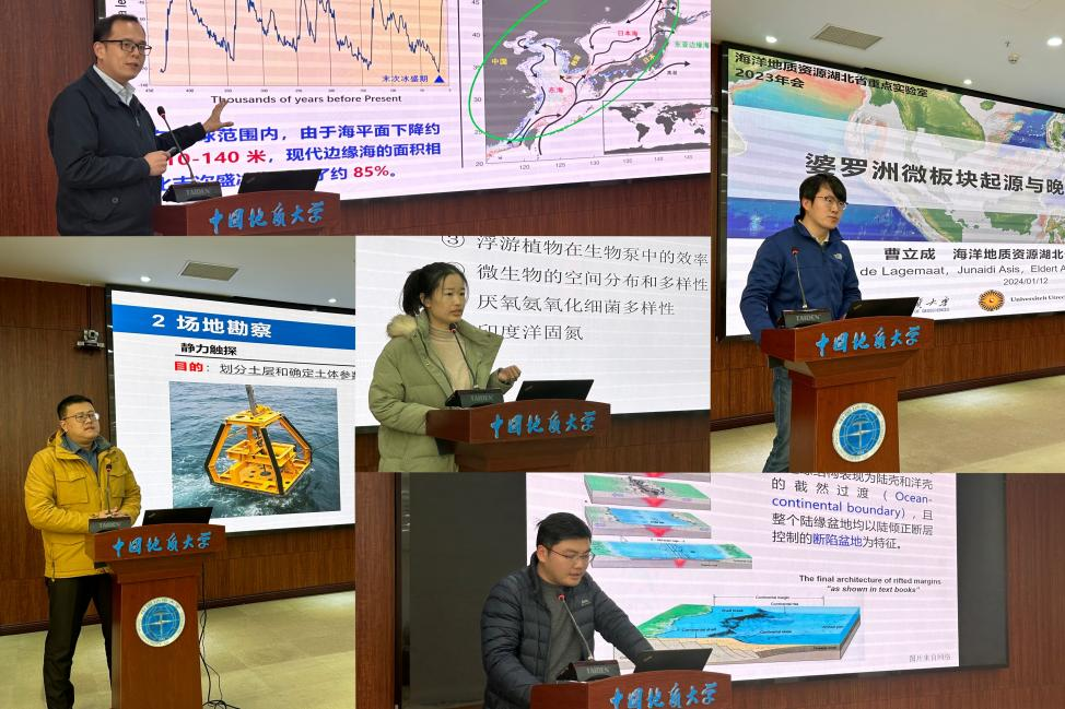 学术年会由实验室主任解习农教授主持。实验室的五位青年骨干:宫勋教授、雷超教授、董友扣特任教授、曹立成副教授,吴茜副教授受邀,分别以“海平面上升对东亚边缘海洋流模态的拐点研究”、“边缘海盆地伸展破裂过程”、“岩土力学在海底地质灾害和岛礁工程中的应用”、“婆罗洲微板块来源及晚白平世古地理”和“生态学初探”为主题,给大家分享了他们最新的科研成果,为国内外同行展示相关领域的前沿研究动态。
