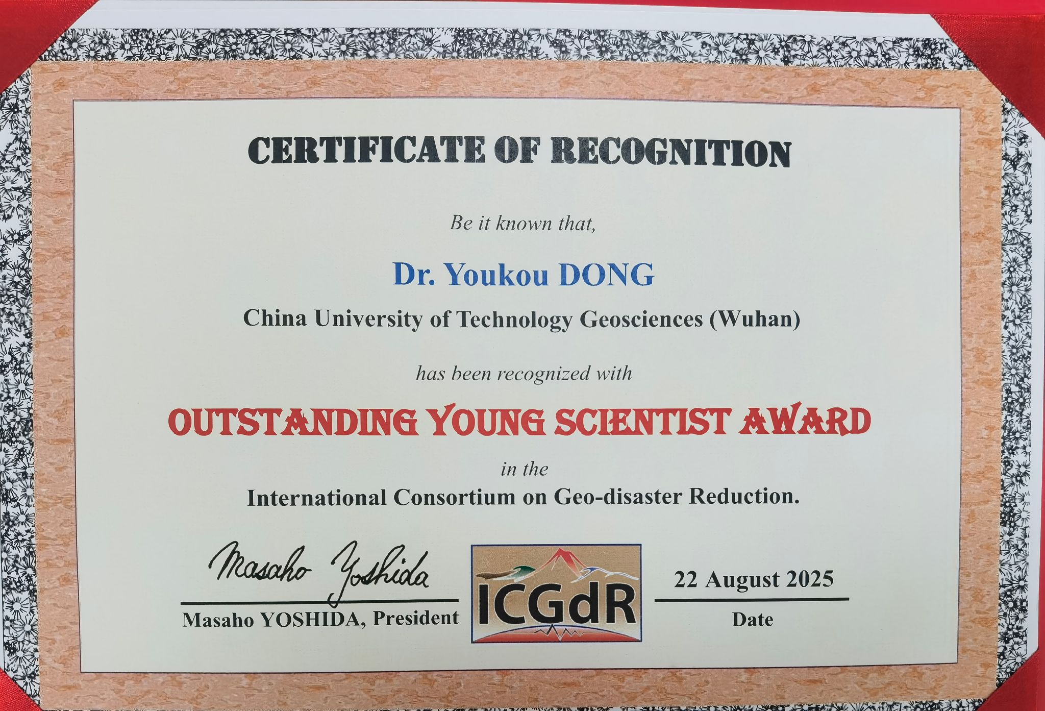 8月23日-26日,由国际地质灾害与减灾协会(ICGdR)主办的第23届国际地质灾害与减灾研讨会(ISGdR 2025)在宜宾召开。会上,麻豆影视 董友扣教授荣获2025年度国际地质灾害与减灾协会“杰出青年科学家奖”(ICGdR Outstanding Young Scientist Award)。