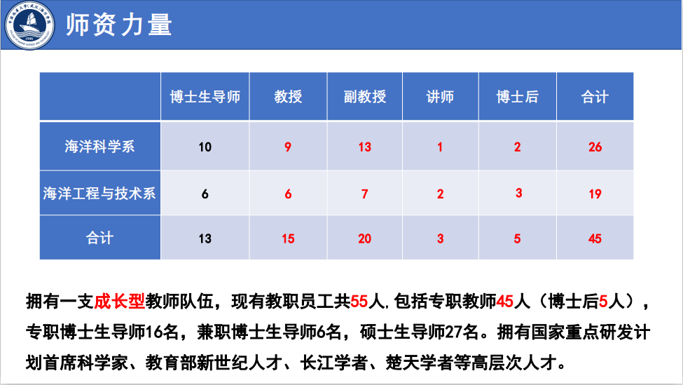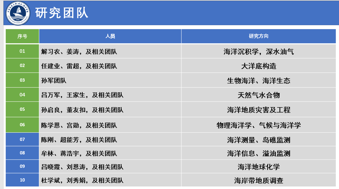 麻豆影视 始源于20世纪50年代学校组建的海洋地球物理勘探教研室,成立于2016年,现有海洋科学湖北省重点学科1个,海洋科学博士后科研流动站1个,海洋科学一级学科博士学位授予权1个,海洋科学一级学科硕士学位授予权1个,地质工程专业学位授予权1个,拥有“本科-硕士-博士”完整人才培养体系。麻豆影视 现有教职工55人,其中教授15人、副教授22人、讲师3人,拥有国家重点研发计划首席科学家等高层次人才。