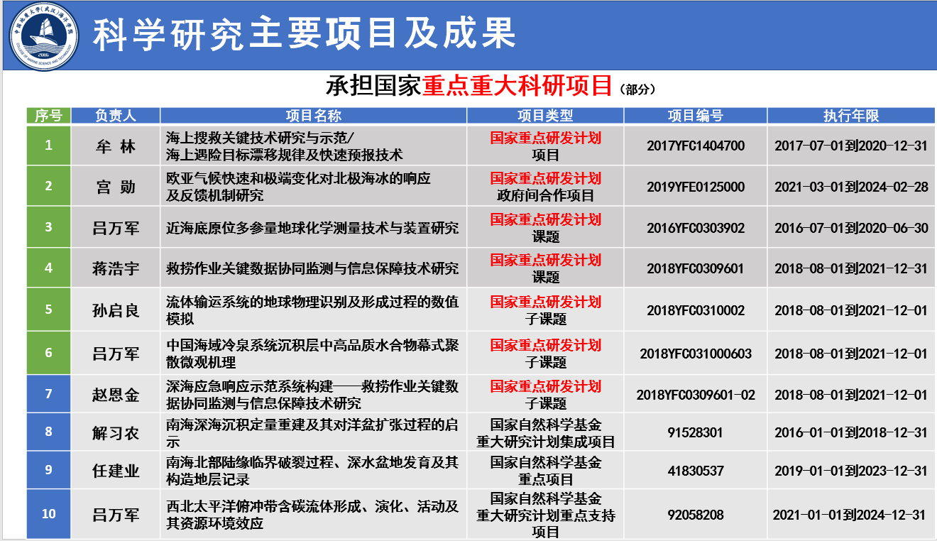 国家863、973子课题(专题)13项、国家自然科学基金课题34项、国家海洋重大专项配套课题16项、省部级(重点)课题49项、重大横向课题36项等。