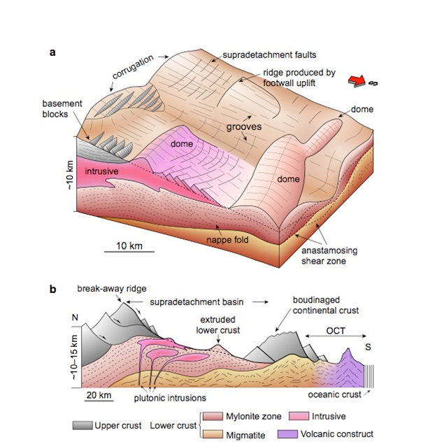 大陆裂谷记录了地球演化的脉动,根据地壳岩石圈热-力学性质的不同可形成宽或窄的裂谷带。窄裂谷带宽约 100 公里,如著名的东非大裂谷;宽裂谷带则可达 1000 km, 如著名的美国西部科迪勒拉山发育的盆岭省,其长逾 1500 km 宽超过 1000 km。我国南海被动陆缘保存了典型的宽裂谷带特征,其南、北部边缘分别达到了 1000 km 500 km 宽。近年来的大洋钻探计划(IODP)没有发现大西洋型的地幔剥露,进一步显示南海的演化可能与大西洋型被动陆缘不同。结合高清的地震数据和典型构造变形的对比,本文详细记录了位移量超过 100 km 的大型拆离断层,变质核杂岩,以及地壳尺度的韧性折叠层和岩浆侵入体,根据这些变形特征与典型宽裂谷作用下的构造变形对 比,我们提出南海的裂谷作用发生在较高的地温条件下,早期曾经历了跟美国西部盆岭省和爱琴海的宽裂谷作用变形极为相似的过程,但是最终发生了岩石圈裂解。