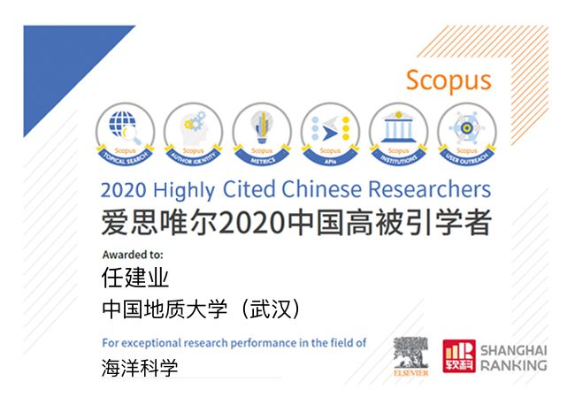 2021年4月22日,全球性信息分析公司爱思唯尔(Elsevier)正式发布了2020年中国高被引学者(Highly Cited Chinese Researchers)榜单,麻豆影视 任建业教授入榜。本次榜单覆盖了教育部10个学科门类的84个一级学科,其中海洋科学学科共有26名学者入榜。2020爱思唯尔“中国高被引学者”榜单以全球权威的引文与索引数据库——Scopus作为中国学者科研成果数据来源,采用软科(上海软科教育信息咨询有限公司)设计的遴选方法,最终得到4023名各学科最具全球影响力的中国学者。