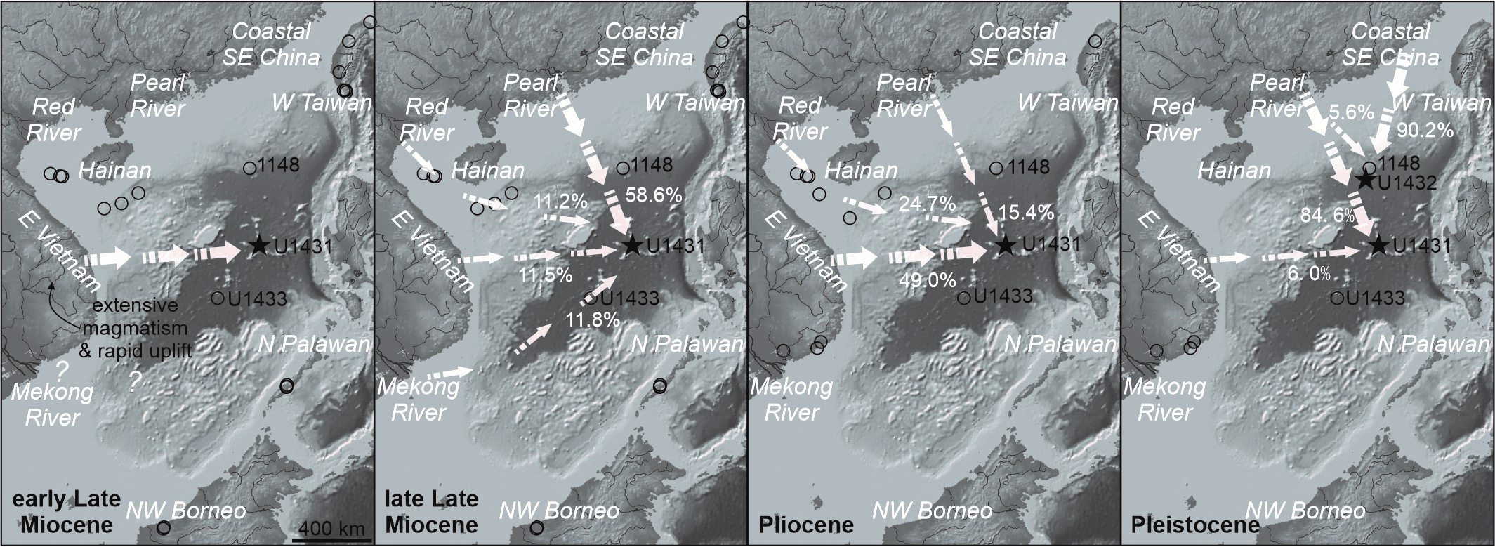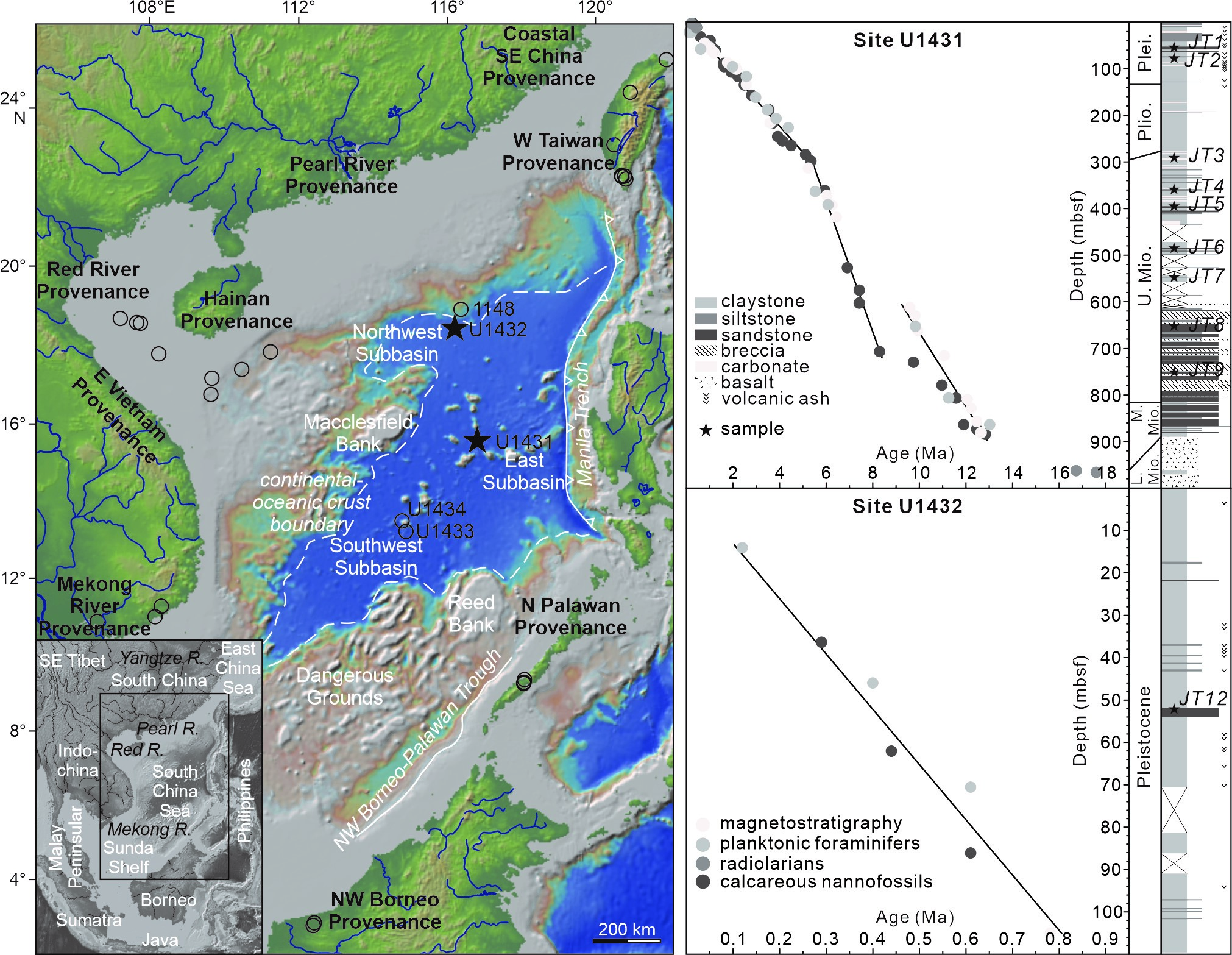 源汇系统是研究沉积物从剥蚀区至沉积区过程中组分的时空变化特征和各种控制因素,是连接地球深部和表层地质过程的重要一环。目前,陆地及大陆边缘的源汇系统已有广泛的研究,但是对深海盆地中沉积路径的认识还较为薄弱。东亚和东南亚是世界上最大的沉积物供给区,每年向海洋输送的河流沉积物通量约占全球总量的一半。南海作为西太平洋最大的边缘海,捕获了周缘陆地不同尺度河流的大量沉积物(图1)。这些河流供给的粗颗粒碎屑沉积物一般堆积在南海大陆边缘,很少进入平均水深达4700米的深海盆地。目前,南海两侧大陆边缘的沉积记录已获得工业勘探和科学钻探的广泛关注,但是深海盆地沉积记录的研究程度一直较低。国际大洋发现计划(IODP)349航次首次在南海扩张轴附近获得了连续的新近系沉积序列:除了普遍存在的半深海相至深海相沉积,多个站位揭示了由砂岩、粉砂岩、碳酸盐等组成的多套浊积岩单元,其中碎屑组分的比例在东部次海盆站位中更高(图1)。这些碎屑浊积岩在深海盆地环境较为罕见,其物质来源也尚不明确。