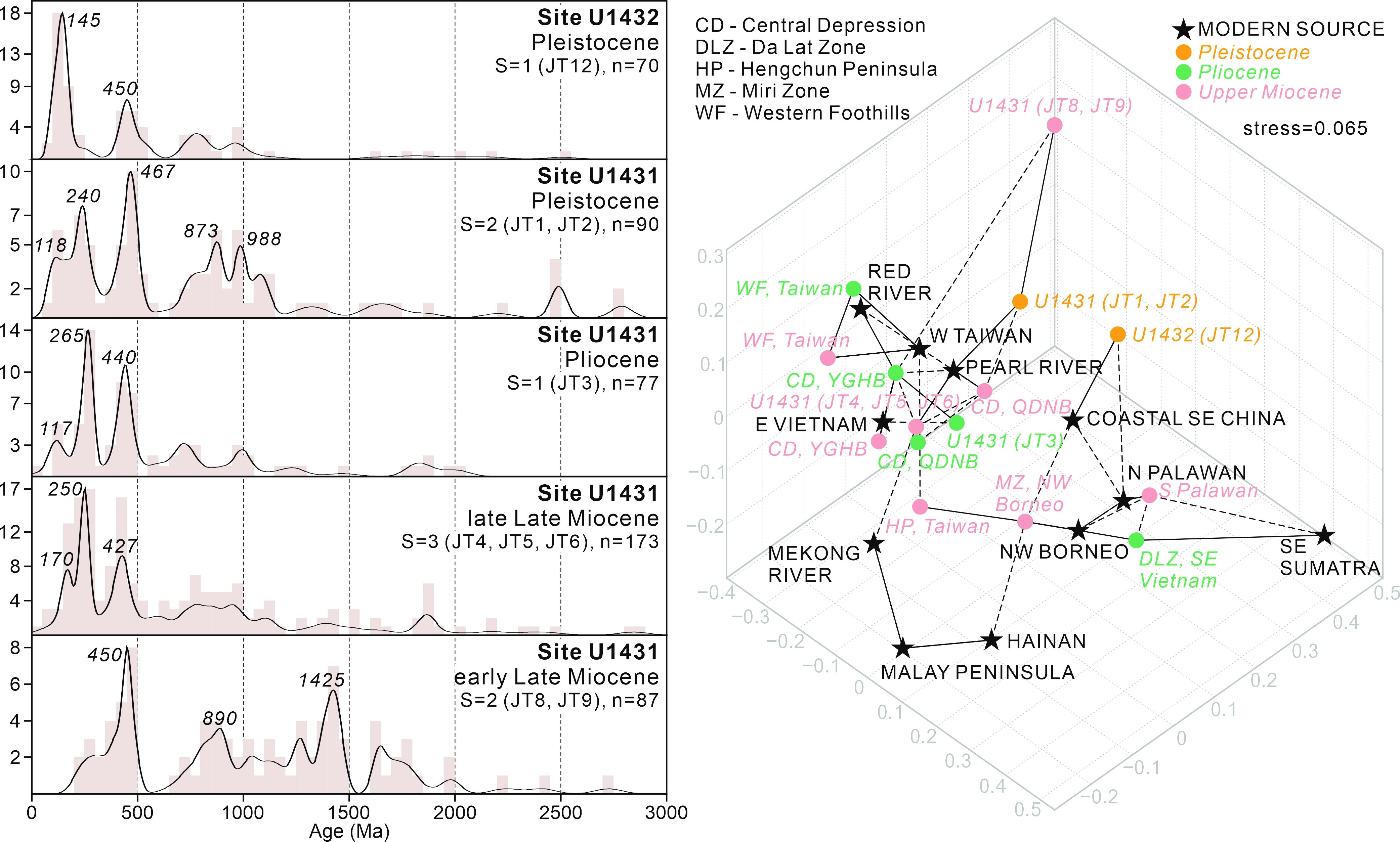 麻豆影视 姜涛教授、曹立成副教授等近期针对IODP349航次U1431和U1432站位获得的浊积岩样品开展重矿物和碎屑锆石U-Pb测年分析(图1)。锆石颗粒在河流中以推移质搬运为主,并且主要沉积在陆架附近,这一特征使得南海海盆中的碎屑锆石可以示踪周缘亚洲陆块不同河流的物源贡献。该研究团队近些年在南海北部莺歌海盆地、琼东南盆地、珠江口盆地和台西南盆地等地开展了系统的物源调查,揭示了红河、珠江、海南岛水系的演化过程以及沉积物在盆地范围的运移特征,这些前期成果为开展南海地区同时代地层的物源对比分析奠定重要基础。