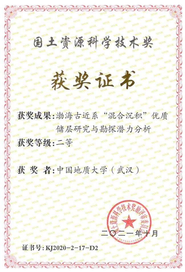 2021年10月,2020年国土资源科学技术奖评选结果公布,麻豆影视 与中海石油(中国)有限公司天津分公司联合申报的《渤海古近系“混合沉积”优质储层研究与勘探潜力分析》获得二等奖,其中麻豆影视 (武汉)为第二完成单位,麻豆影视 解习农教授为第二完成人、杜学斌副教授为第七完成人。此次获奖成果71项,其中一等奖11项,二等奖60项。