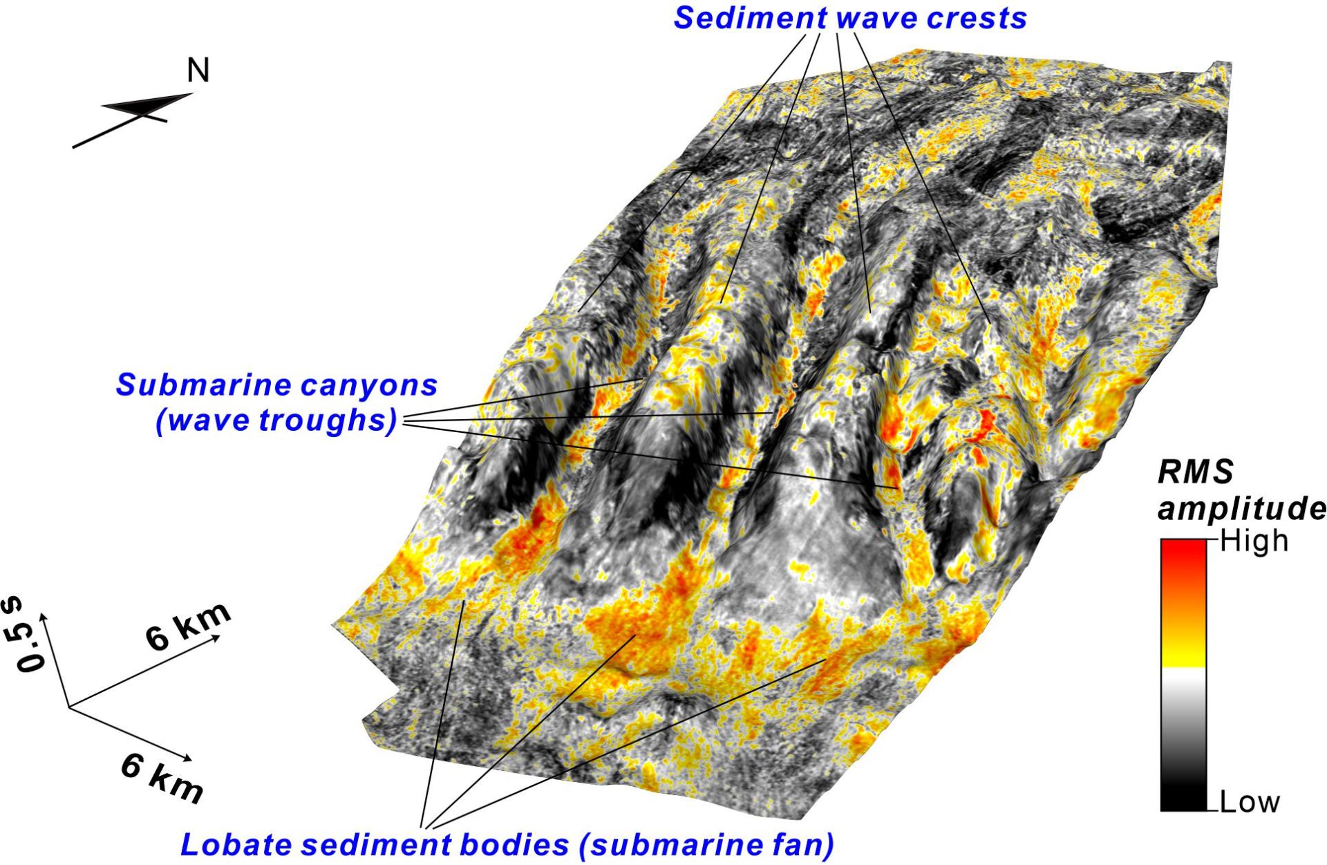本研究利用高分辨率三维地震数据对该峡谷群开展了进一步的研究,结果表明这些峡谷主要是沿着沉积物波波谷分布。虽然海底峡谷所造成的崎岖海底会使得地震成像出现波状起伏的“假象”,但是地震相分析显示,海底无峡谷区域之下亦可见到波状起伏地貌,且这些波状起伏地貌之上可见上超、底超反射特征(图1),由此表明其并非处理假象。在此基础上,综合其总体地貌特征、内部地震反射特征以及区域上存在的底流背景,本研究将这些近于等间距分布的波状起伏地貌解释为底流成因沉积物波。