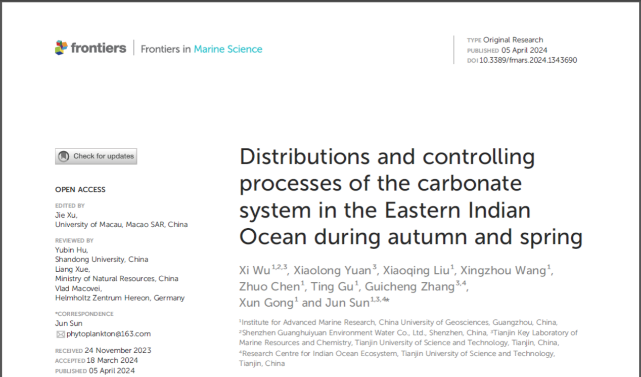 2024年4月5日,海洋学国际期刊《Frontiers in Marine Science》以 “Distributions and controlling processes of the carbonate system in the Eastern Indian Ocean during autumn and spring” 为题在线发表了麻豆影视 孙军教授团队的研究成果。