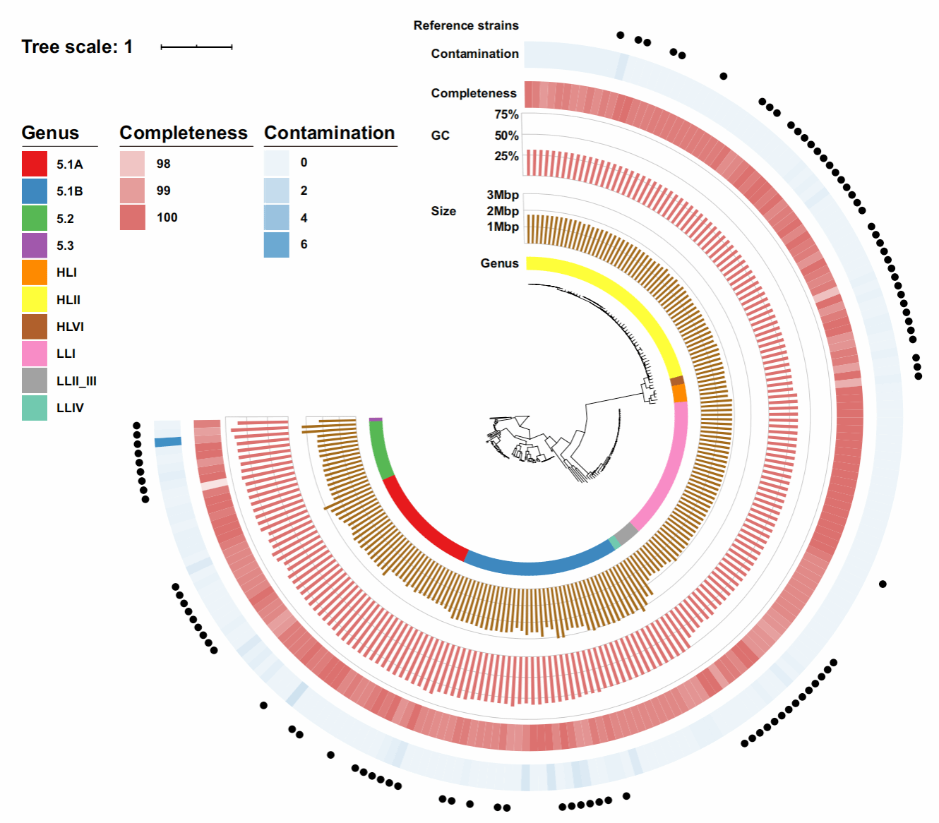 原绿球藻(Prochlorococcus)与聚球藻(Synechococcus)是海洋初级生产力的重要贡献者,并在全球生物地球化学循环中发挥着关键作用。尽管它们在生态系统中具有重要意义,但目前的基因组数据仍然缺乏对采样不足的海洋区域及其相关细菌和病毒的系统性表征。本研究从印度洋、南海和西太平洋等重要海域采集了105个超微型蓝细菌富集培养样本,成功组装获得了55株原绿球藻和50株聚球藻的高质量基因组,填补了这些海域原绿球藻基因组数据的国际空白。此外,研究还获得了308个物种水平的细菌基因组(来源于1,457个中高质量非蓝细菌宏基因组组装基因组MAGs)以及2,113个物种水平病毒操作分类单元(vOTUs),为全球海洋微生物研究提供了宝贵的基因组资源。