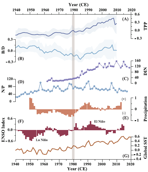 本研究通过对东海海域近百年生物标志物反演的初级生产力数据进行整理和分析,通过多种统计方法对百年来硅、甲藻的变化特征和主要调控因素进行了分析,结果指示着东海区域的生产力格局存在空间异质性。研究结果体现了陆-海统筹对海洋初级生产力格局的影响,气候模态变化调控着长江流域径流量变化,携带着更多人类影响下营养物质,影响着海洋硅/甲藻群落的变化。