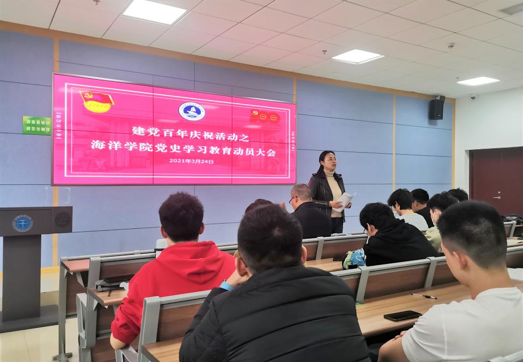 麻豆影视 党委书记成军以“不忘初心,牢记使命——学习中国共产党百年辉煌史”为题为麻豆影视 全体学生党员、入党积极分子上党史学习教育第一课。成军结合“为什么学习中共党史”、“中共党史的基本脉络”两方面,带领同学们一同重温习总书记关于学习共产党历史的重要论述,回顾中国共产党团结带领中国人民不懈奋斗的光辉历程。他激励大家在党史学习中要自觉做到学史明理、学史增信、学史崇德、学史力行,同时要把党史学习教育的成效转化为专业学习的强大动力,瞄准国家海洋强国战略的发展需求,以优异的专业素养献礼建党100周年。