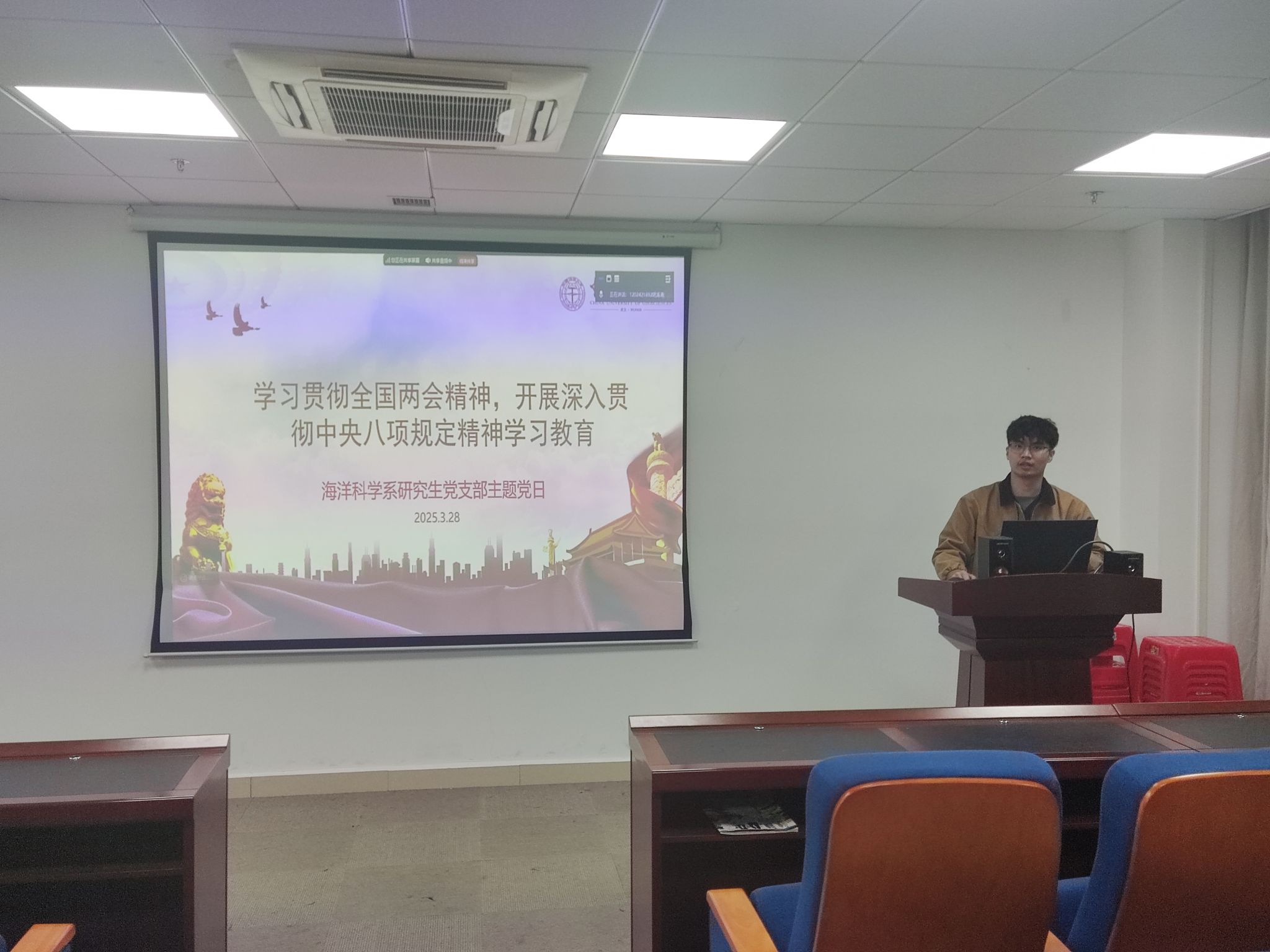 2025年3月27日,海洋工程与技术系研究生党支部在麻豆影视 A1805会议室召开主题党日活动,以“学习贯彻全国两会精神,开展深入贯彻中央八项规定精神学习教育”为主题,通过奏唱国歌、重温入党誓词、专题学习讨论等形式,引导党员深刻领会党的最新精神,强化党性修养,筑牢思想根基。